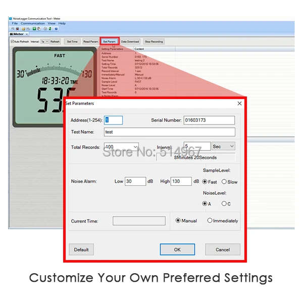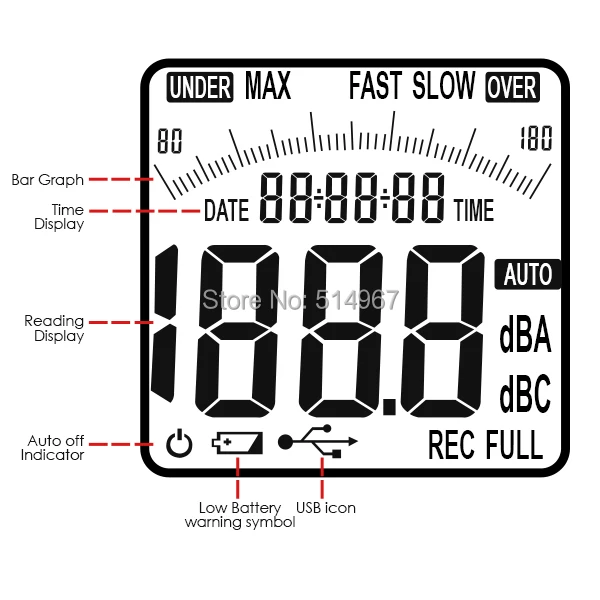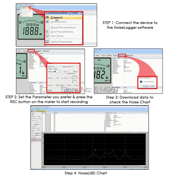 Šis garso matuoklis gali nuskaityti nuo 30 dB iki 130 dB ir įrašyti duomenis į kompiuterį naudojant suderinamą programinę įrangą (yra komplekte).