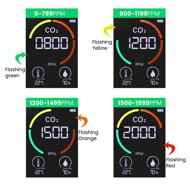 1. Didelis LCD ekranas, skirtingos šrifto spalvos rodo skirtingą oro kokybę, žalia 0-799 ppm, geltona 800-1199 ppm, oranžinė 1200-1599 ppm, raudona 1600-1999 ppm, 2000 ppm virš keturių spalvų vienu metu mirksi.