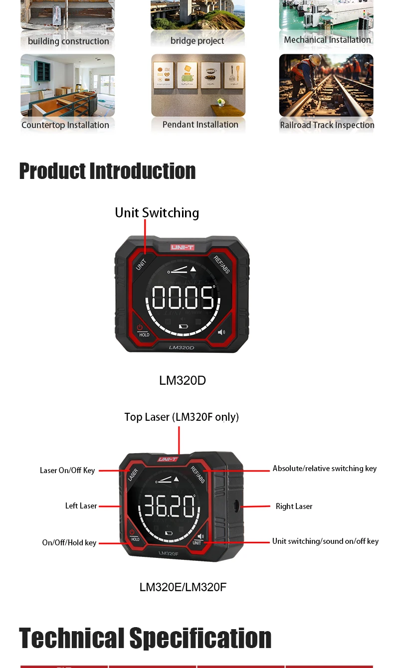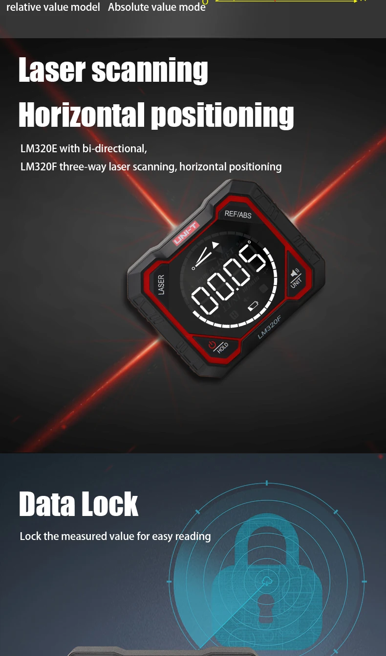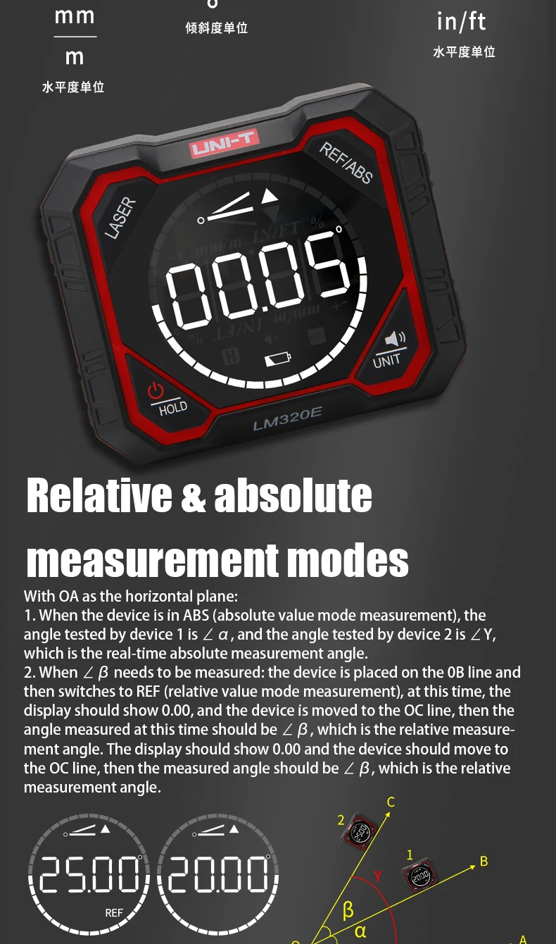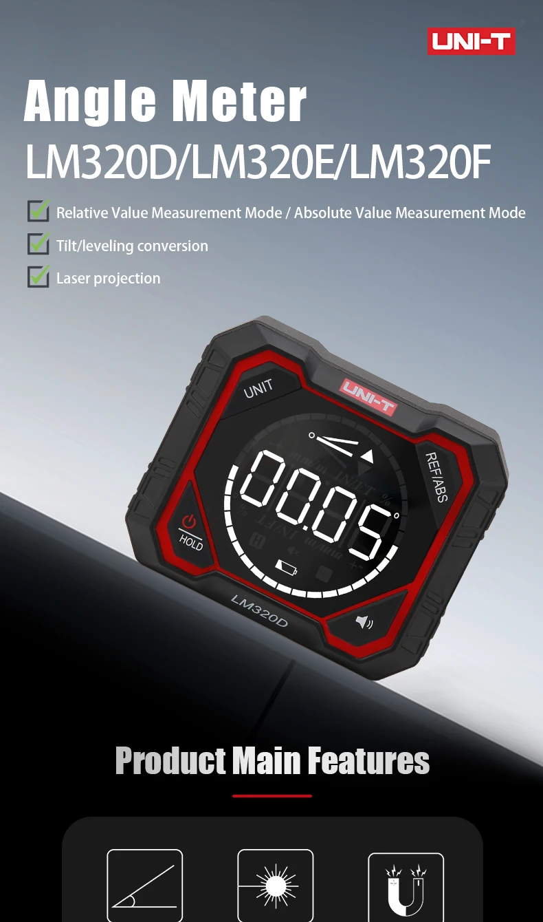 UNI-T LM320D elektroninis kampo matuoklis arba UNI-T LM320E /F lazerinis kampo matuoklis